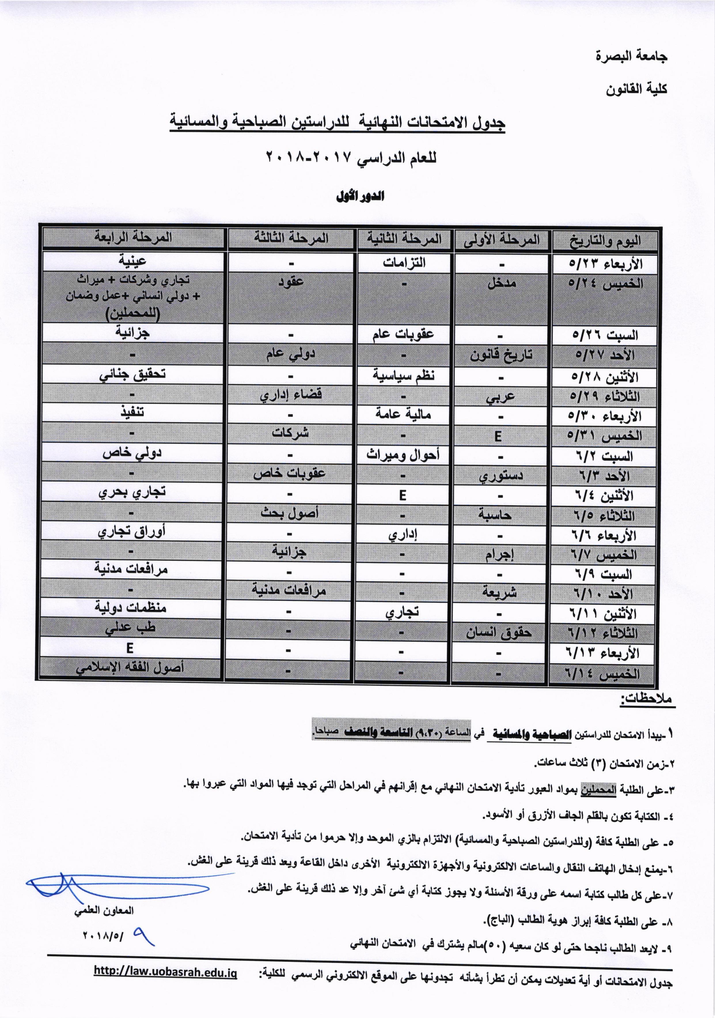 اعلان الجدول للامتحانات النهائية للمراحل كافة وللدراستين الصباحية والمسائية