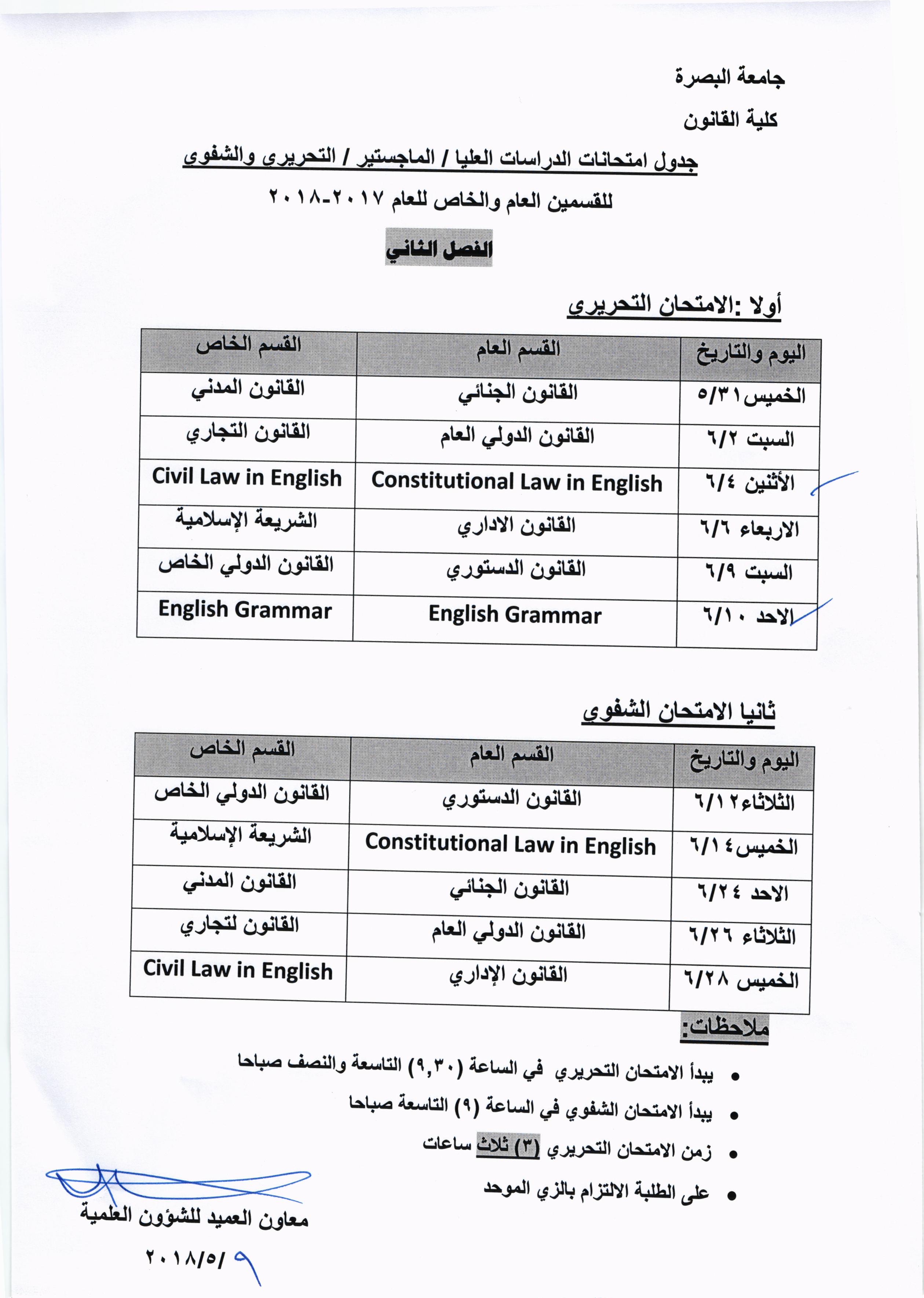 جدول امتحانات الدراسات العليا الماجستير التحريري والشفوي