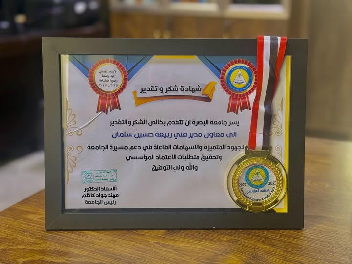 بمناسبة حصول جامعة البصرة على الاعتماد المؤسسي حصول الست ربيعة حسين سلمان على درع التميز لمسؤولي شعب ضمان الجوده والاعتماد الاكاديمي .